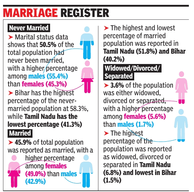 The Census data also shows more men and women remain unmarried than earlier. In 2011, about 6.4% of all persons older than 25 years were unmarried. That works out to about 3.89 cr people -2.89 crore men and 1 crore women. In 2001, the proportion of never married persons in the above 25 years age group was slightly lower at 5.3%.That's 2.5 crore persons -1.95 crore men and 56 lakh women.