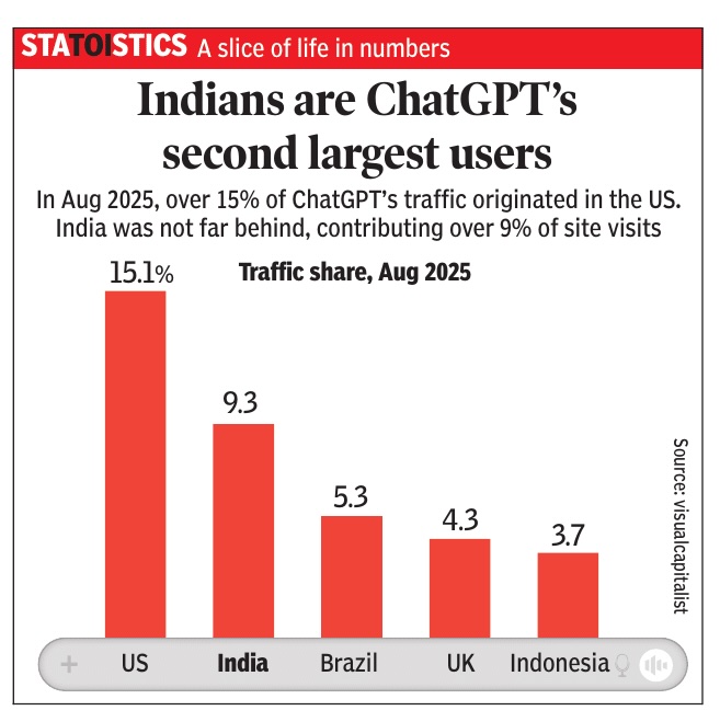 The top 5 countries from which ChatGPT traffic originated in August 2025.