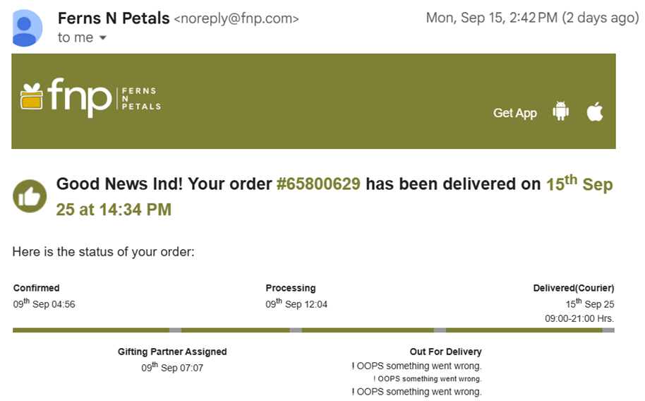 Instead, Ferns And Petals India had the cheek to inform “ Good News Ind! Your order #65800629 has been delivered” i.e. two days after the birthday!!!!!!