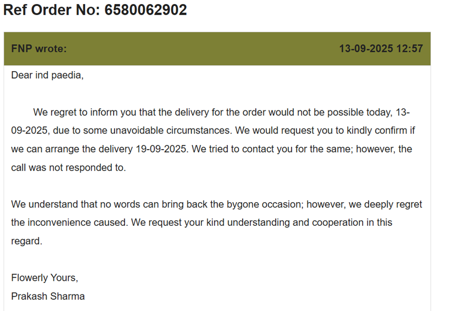 Despite written assurances and confirmed delivery dates, Ferns N Petals failed to deliver both the cake and flowers on the promised day—13 September 2025, the birthday itself.