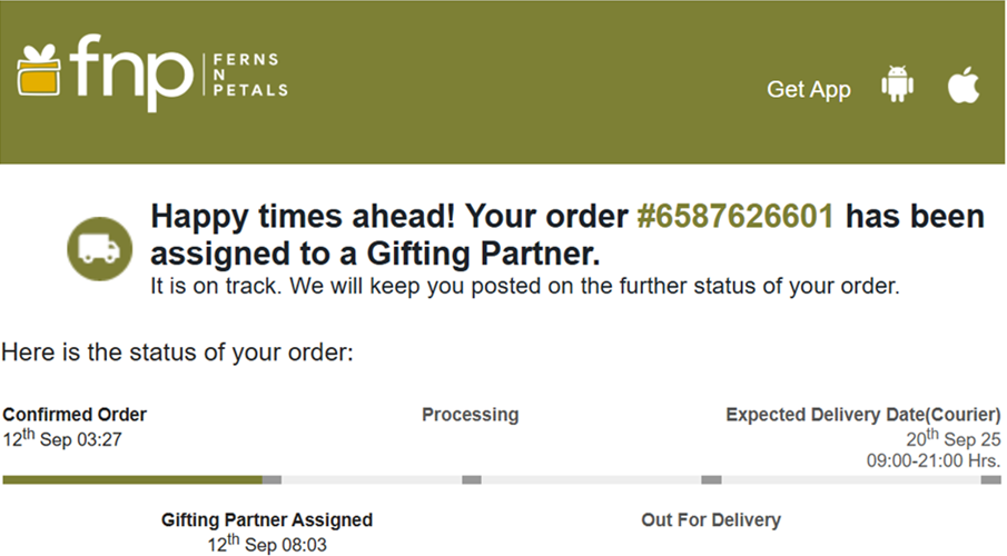Just over two hours later (7:08 AM), Ferns And Petals India informed “Customer Your order 65800629 has been Accepted By Gifting Partner”…”Expected Delivery Date(Courier) 13th Sep 25 09:00-21:00 Hrs.”