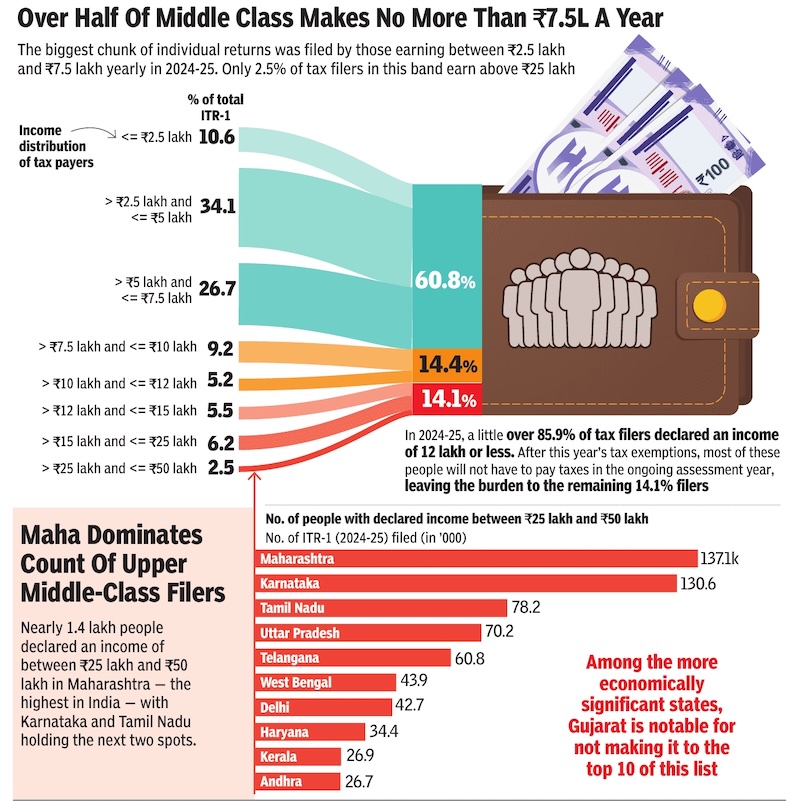 What’s more, while Maharashtra had the highest number of taxpayers with declared incomes of between 25 lakh and 50 lakh for the assessment year 2024-25, Gujarat didn’t even make it to the list of top 10 states. This came out during a Lok Sabha question where the govt was asked about the middle class numbers. Atul Thakur analyses I-T returns filed by business persons and professionals to map India’s middle class.