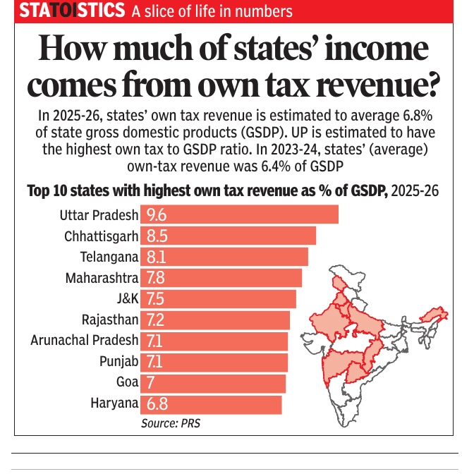Among the various streams of states own revenue, a large collection comes from States’ Goods and Services Tax (SGST) as well as from VAT and excise duty on alcoholic drinks, petroleum products and electricity (which are outside the GST framework).