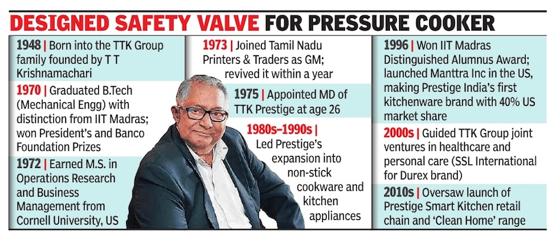 Under his watch, Prestige evolved from a pressure-cooker manufacturer to a full kitchen-solutions brand spanning cookware, electrical appliances, and home-care products.