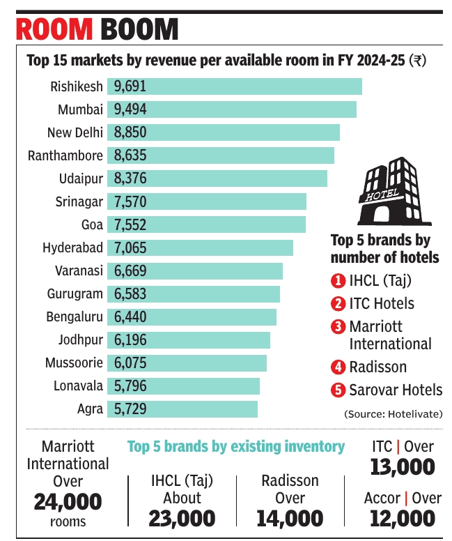 Leading hospitality consulting firm Hotelivate’s recent report for 2024-25 shows the holy town in Uttarakhand on top of the pile for the second consecutive year, though its revenue per available room (RevPAR) declined marginally by about 4% to Rs 9,691 from Rs 10,086 in FY 24.