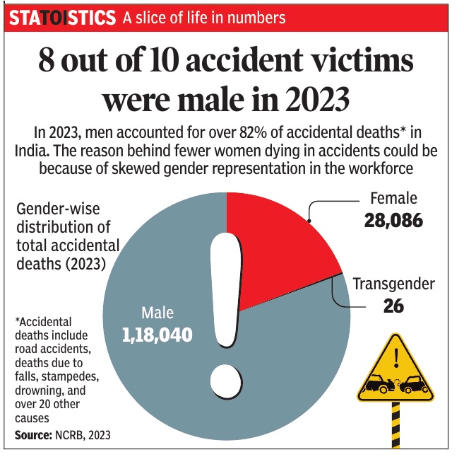 What explains the increased skew? In the case of accidents, one reason is the increasing contribution of road accidents. Half a century ago, road accidents accounted for just about 5% of all accidental deaths – 7,071 of 1.3 lakh in 1969. In 2019, they accounted for close to 37% of the total – 1.5 lakh of 4.2 lakh. Road accident victims have always been overwhelmingly male for obvious reasons. In 2019, 1.3 lakh of the 1.5 lakh people who died in road accidents were male. As they account for a larger share of all accidental deaths, therefore, the gender skew gets accentuated. | What explains the increased skew? In the case of accidents, one reason is the increasing contribution of road accidents. Half a century ago, road accidents accounted for just about 5% of all accidental deaths – 7,071 of 1.3 lakh in 1969. In 2019, they accounted for close to 37% of the total – 1.5 lakh of 4.2 lakh. Road accident victims have always been overwhelmingly male for obvious reasons. In 2019, 1.3 lakh of the 1.5 lakh people who died in road accidents were male. As they account for a larger share of all accidental deaths, therefore, the gender skew gets accentuated. | ||