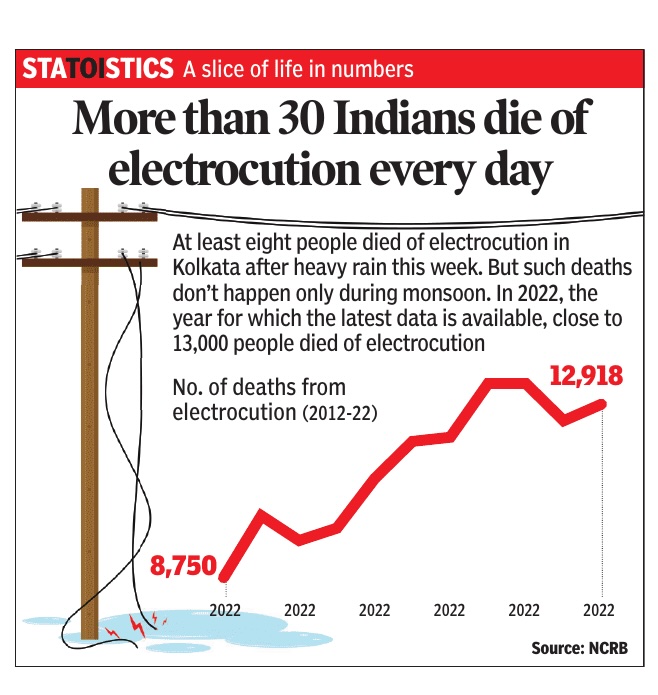 Experts said that in developing countries like India, there is less awareness on safety and electric equipment is often not used as per standards laid down. While the normal distance between two electric poles should be 50 feet and pillar height at least 18 feet, these guidelines are mostly flouted. Power lines have remained above ground where they are prone to physical deterioration and outages. Gusty winds can snap even the strongest lines and towers, letting them fall on unsuspecting victims, like in a recent incident in UP’s Sambhal where four kids were electrocuted in June as a live wire fell on a tube well pool where they were bathing. Sarvesh Saini, father of two boys who perished in the incident, told TOI, “There is no joy left in our lives.”