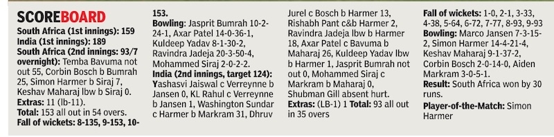 Spinners, mainly Simon Harmer, did the rest, although with some help from India’s batters. They could have applied themselves better, as India coach Gautam Gambhir admitted later. However, it was a pacer who triggered India’s downfall, with Marco Jansen reducing the hosts to two-forone before lunch. Post-lunch and till the stroke of tea, it was all about South Africa’s spin and Indian batters’ follies.