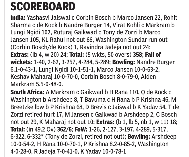 SA’s magnificent chase meant the efforts of the peerless Virat Kohli, who smashed a second successive hundred (102 off 93 balls; 7x4, 2x6) and an impressive Ruturaj Gaikwad (105 off 83 balls, 12x4, 2x6) — who cracked his maiden ODI century off just 77 balls — went in vain. So did stand-in-captain KL Rahul’s 66 not out (43 balls, 6x4, 2x6).