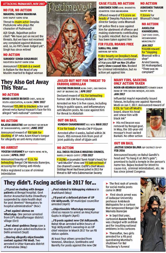 | + | [[File: Online posts can land one in jail but one can get away with death threats, 2016-17.jpg| Online posts can land one in jail but one can get away with death threats, 2016-17 <br/> From [http://epaper.timesgroup.com/Olive/ODN/TimesOfIndia/shared/ShowArticle.aspx?doc=TOIDEL%2F2017%2F12%2F08&entity=Ar01414&sk=F73C1C6D&mode=text December 8, 2017: ''The Times of India'']|frame|500px]] | ||