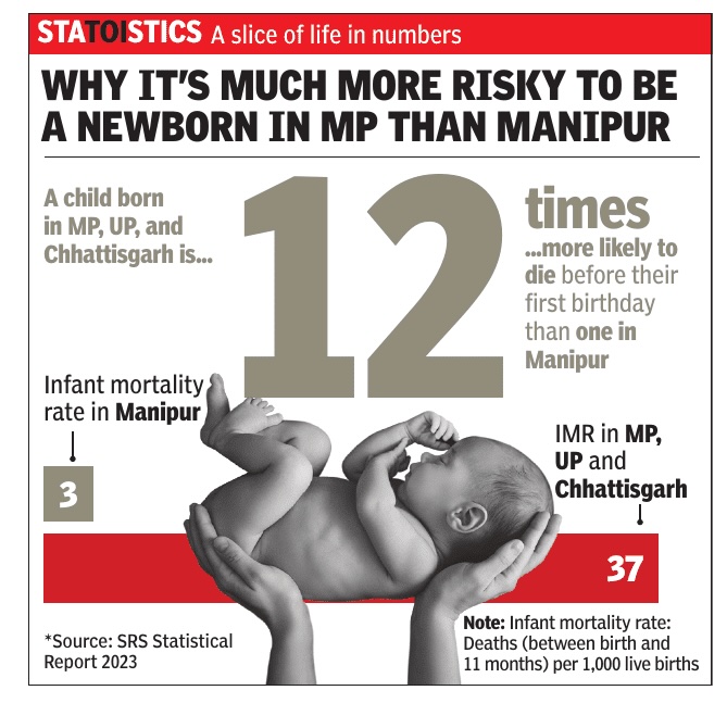 While Madhya Pradesh has im proved its infant mortalities from 50 to 47 this year, UP has reduced deaths from 46 to 43. Similarly , Assam has brought down infant fatalities from 47 to 44, Odisha from 46 to 44, Rajasthan from 43 to 41and Chhattisgarh from 41 to 39. Bihar and Jharkhand, too, have shown an improvement by bringing down deaths from 42 to 38 and 35 to 31 respectively .