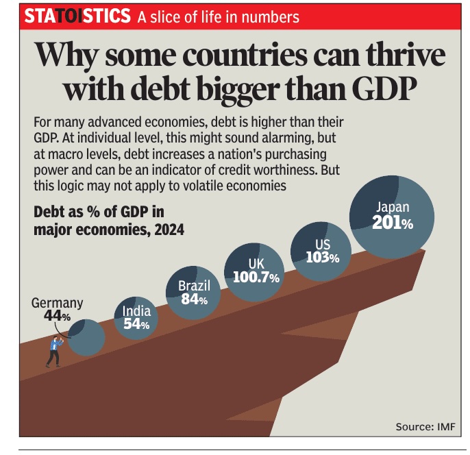 | + | [[File: National debt as a percentage of the GDP of Brazil, China, Germany, India, Japan, the UK and the USA, 2024.jpg|National debt as a percentage of the GDP of Brazil, China, Germany, India, Japan, the UK and the USA, 2024 <br/> From: [https://epaper.indiatimes.com/article-share?article=01_12_2025_010_005_cap_TOI Dec 1, 2025: ''The Times of India'']|frame|500px]] | ||