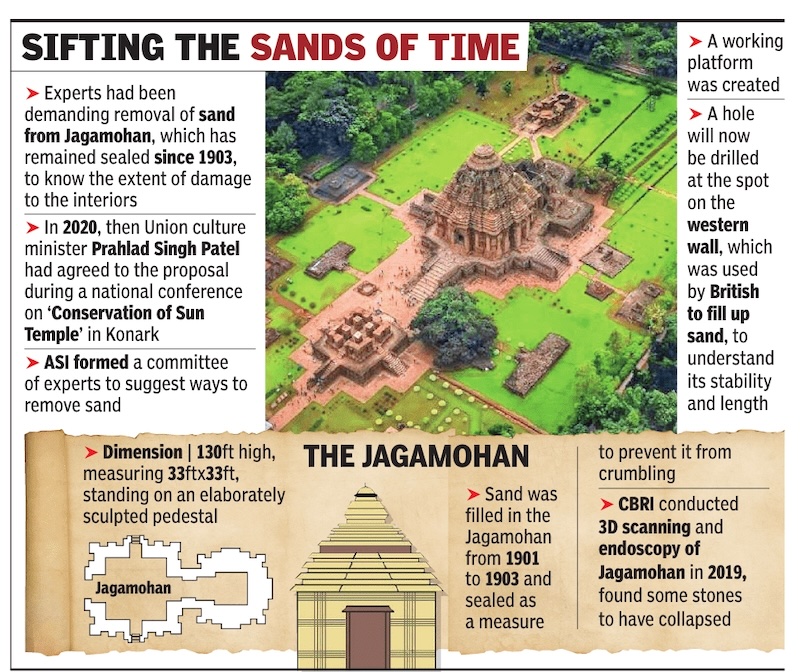 | + | Bhubaneswar: Drums once thundered beneath its vast stone roof. Priests moved through shafts of light. The Jagamohan — the grand assembly hall of the 13th-century Sun Temple in Konark — was built to hold the living pulse of a kingdom. Today, the same sacred chamber lies entombed in silence, its interior packed with tonnes of sand that kept the hall standing — and hidden — for 122 years. | ||