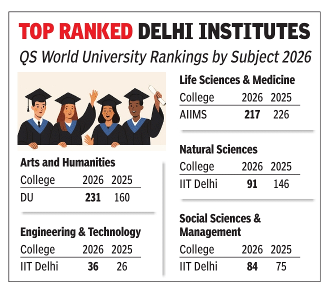 In Arts and Humanities, both DU and JNU saw significant drops compared to last year. DU fell to 231 in 2026 from 160 in 2025 while JNU moved to 260 from 177. The decline suggests increasing global competition in disciplines traditionally considered strongholds for these institutions, even as they continue to remain within the global ranking framework.