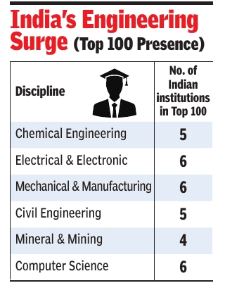| + | The gains are most visible in engineering. Chemical Engineering alone now has five Indian institutions in the global top 100, up from two. Electrical and Mechanical engineering each have six. Civil engineering has five. In Mineral and Mining Engineering, four institutions sit in the top 50.