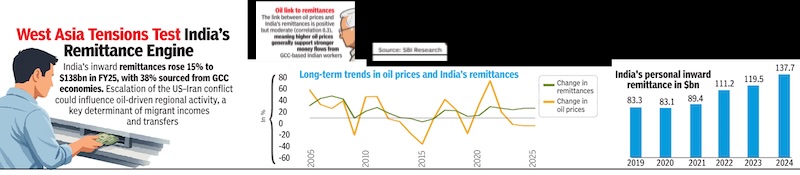 | + | [[File: Remittances To India, vis-à-vis Changes in the price of oil, 2005, 2019-2025.jpg| Remittances To India, vis-à-vis Changes in the price of oil, 2005, 2019-2025 <br/> From: [https://epaper.indiatimes.com/article-share?article=31_03_2026_019_006_cap_TOI March 31, 2026: ''The Times of India'']|frame|500px]] | ||