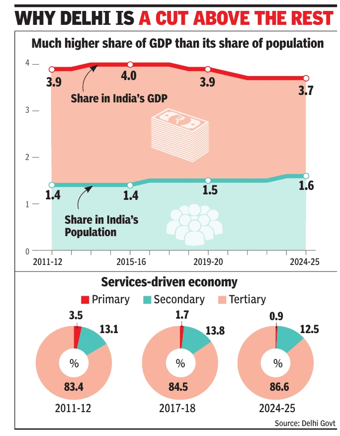 Apart from this, Delhi’s economy is like the advanced economies of western Europe and America. In 2011-12, the share of agricultural activities or the primary sector was 3.5% in its economy, which has now reduced to less than 1%. The share of manufacturing has largely remained the same at around 13% while the share of services has increased from 83.4% to 86.6%.